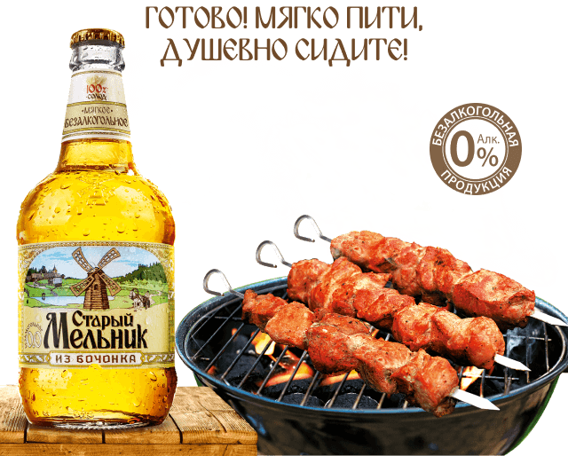 «Старый Мельник из Бочонка Мягкое Безалкогольное» и шашлык — идеальная компания! Легкий вкус пива с приятной хмелевой горчинкой прекрасно сочетается с любым видом мяса и отлично впишется в компанию! Возьмите «бочонок» с собой на природу, приготовьте шашлык в пивном маринаде и проведите душевный день в кругу близких и друзей!
